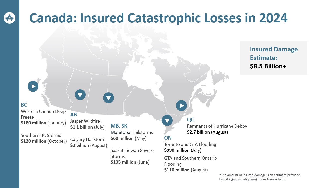 Sources 1983–2007: IBC, PCS Canada, Swiss Re, Deloitte. 2008–2024: CatIQ