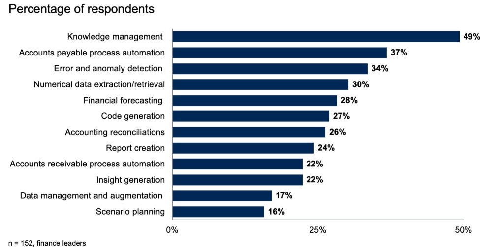 Three use cases stood out as they have been adopted by more than a third of respondents that had implemented AI in their function. Knowledge management – helping organizations organize, retrieve, and leverage information for better decision-making – is the most common AI use case (49%) in finance organizations, followed by accounts payable process automation (37%), and error and anomaly detection (34%) (see Figure 1).